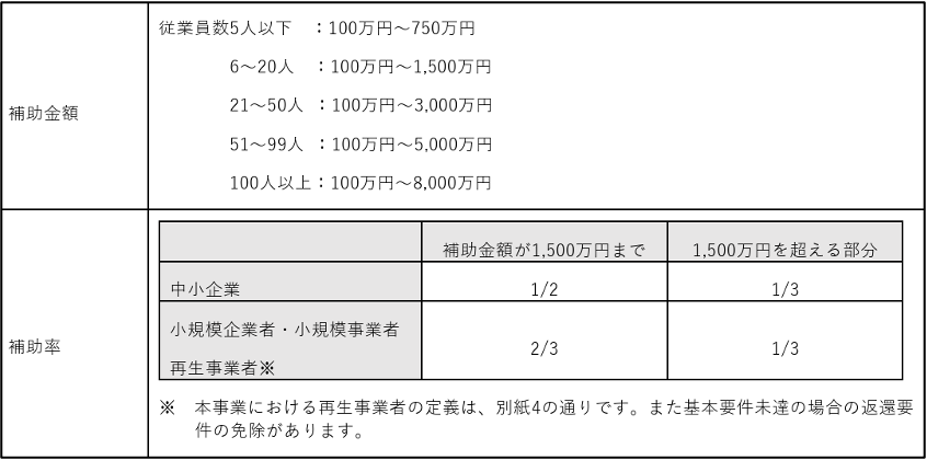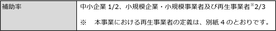 ※小規模企業者・小規模事業者は補助率が2/3ですが、補助金交付候補者としての採択後、交付決定までの間に小規模企業者・小規模事業者の定義からはずれた場合は、補助率1/2となります。