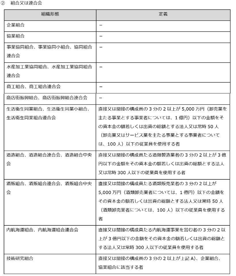 2025年ものづくり補助金の中小企業の定義は下表の通りになっております。