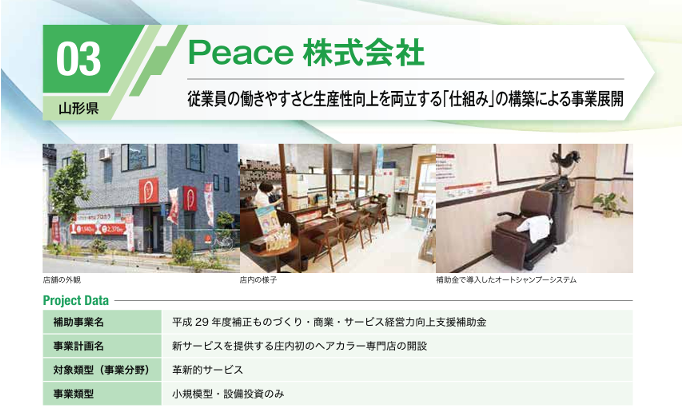 例えば、「令和5年度ものづくり補助金成果事例集」で白髪染め専門店を展開しているPeace株式会社さんが掲載されていました。内容は業界全体で人手不足の中で子育て等により美容師の仕事から離れている人を働き手として注目し、ブランクがあってもできる白髪染めの専門店を開業し、事業に必要な自動洗髪機を補助金で導入しています。