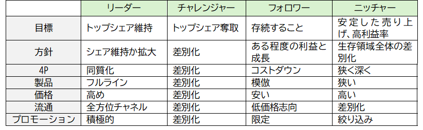 この4つのポジションのうち、自社がどの地位にいるかによって戦略が変わってきます。